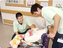 介護の内容は食事や排泄、衣類の着脱、移動等生活全般における介助の他、掃除や生活の記録、さらに散歩や誕生会、花見等の行事やレクリエーションを実施するのも大切な仕事の一つです。また、リハビリ課や栄養課等他職種との連携で日常生活の自立や家庭復帰を目指しています。