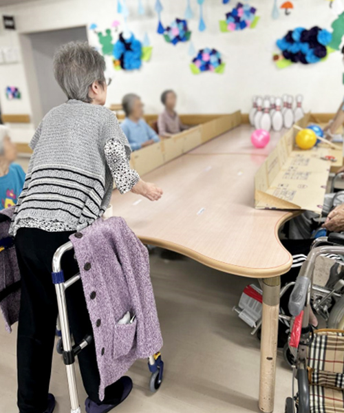 「昔はボーリングの女王だったのよ~」とのご利用者様のお話を受けて、ボーリング大会を行いました。手作りながら本格的!皆様レーンを囲んで、一投毎に嬉々として夢中になられていました。
