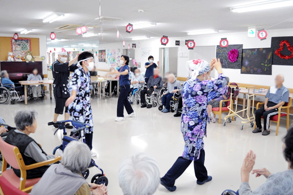 「暑さを吹き飛ばせっ!!」と勢いよく夏祭りを開催しました。皆様で輪になって盆踊りを踊り、とても楽しそうな表情でした。職員が汗だくになりながらの「栗の郷お神輿」のお披露目時には拍手喝采で大盛り上がり!アンコールにもお応えしました。