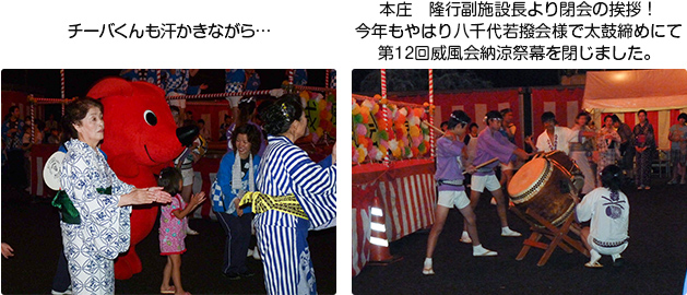 チーバくんも汗かきながら…本庄 隆行副施設長より閉会の挨拶!今年もやはり八千代若撥会様で太鼓締めにて第12回威風会納涼祭幕を閉じました。