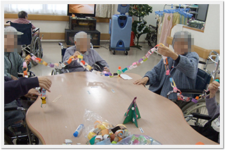 入所者さま一緒にクリスマスツリーを作成し、出来上がったツリーを見ながらケーキを食べました。